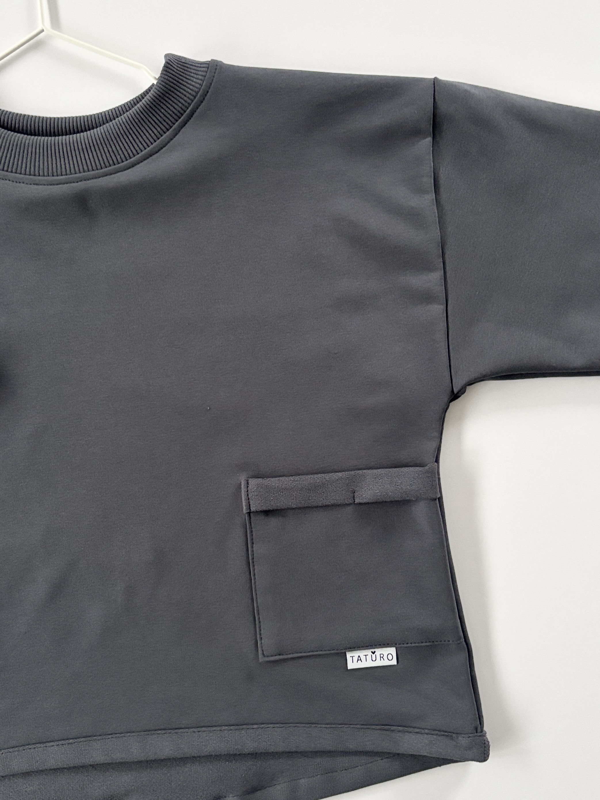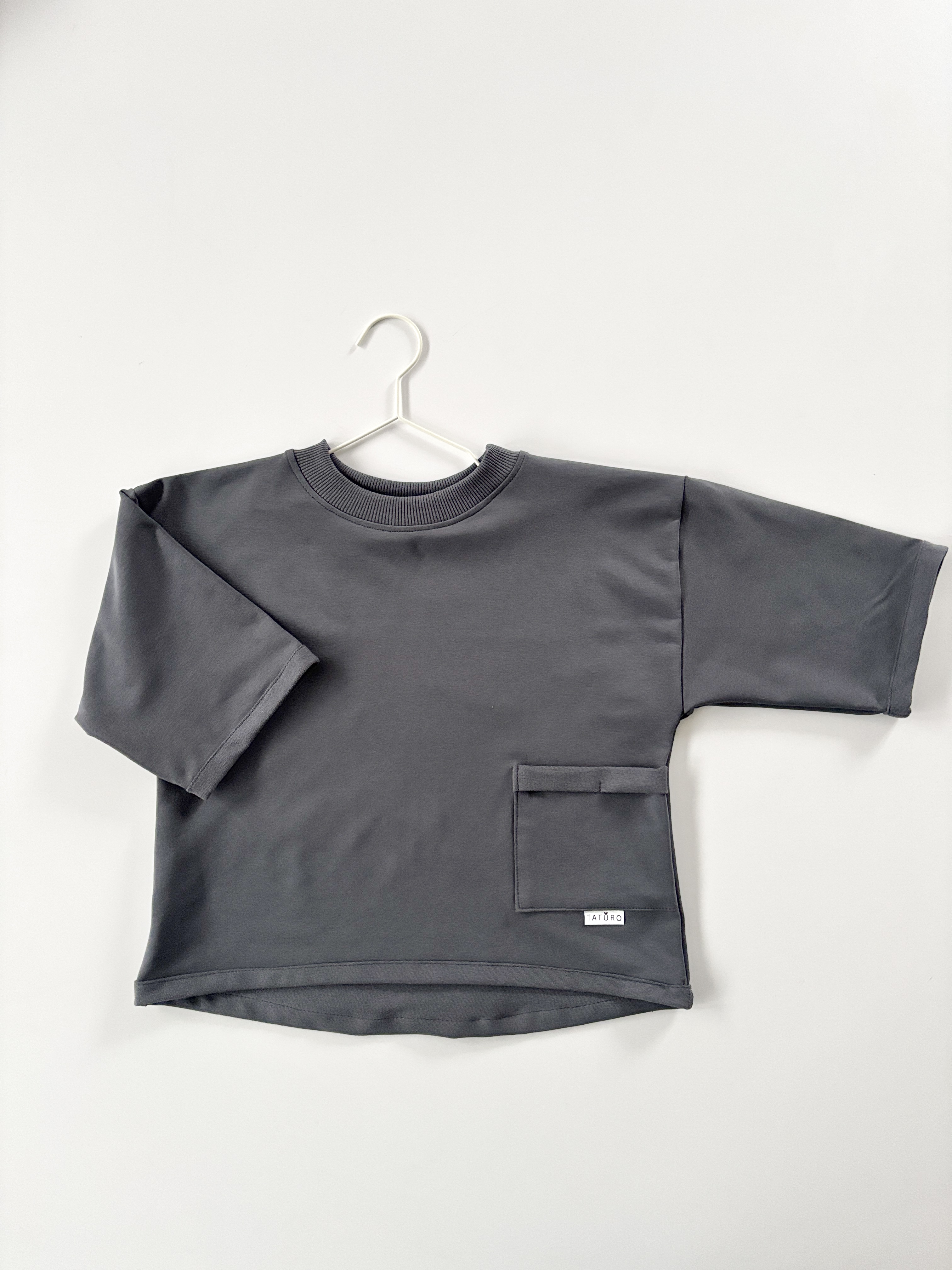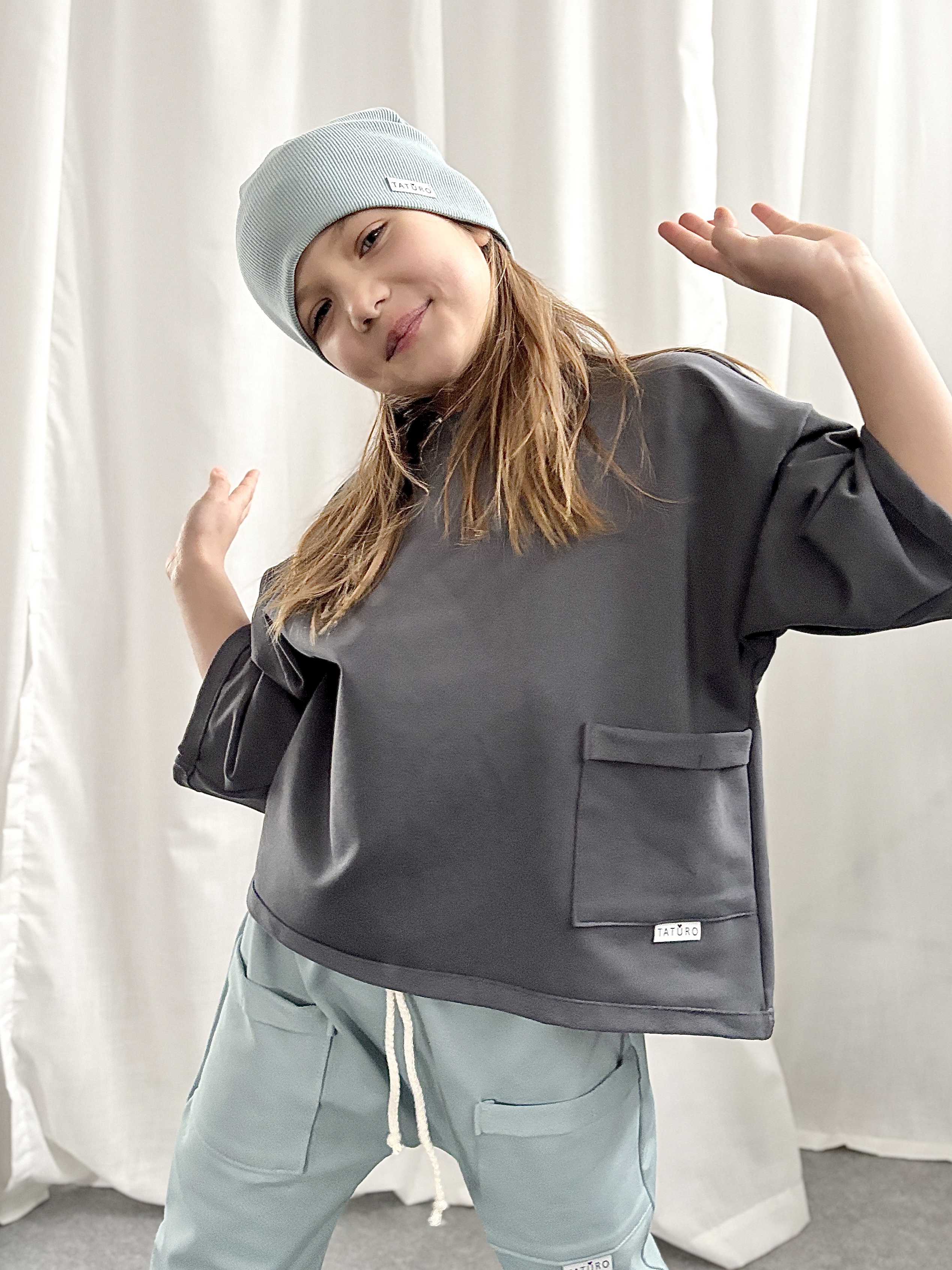 • krój oversizowy, obniżone ramię, długość 3/4 , delikatnie dłuższy tył,
