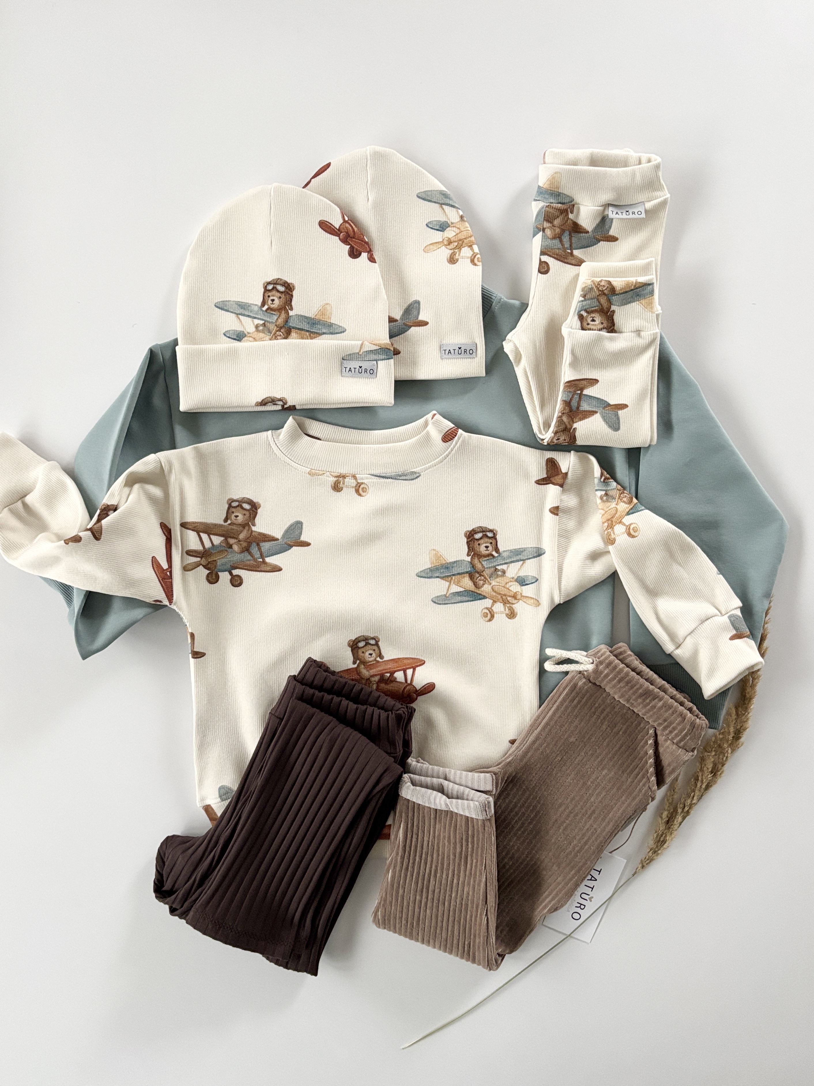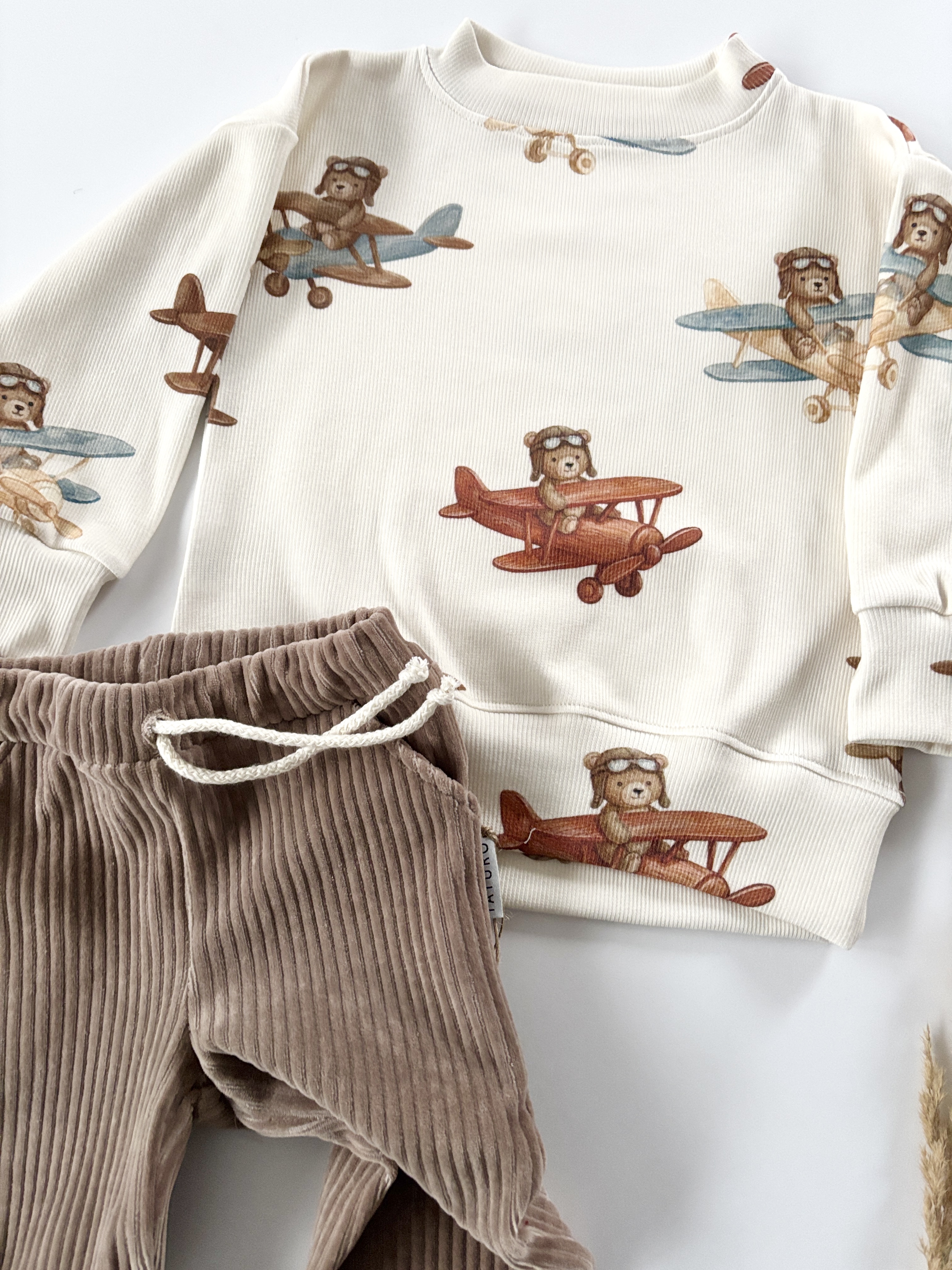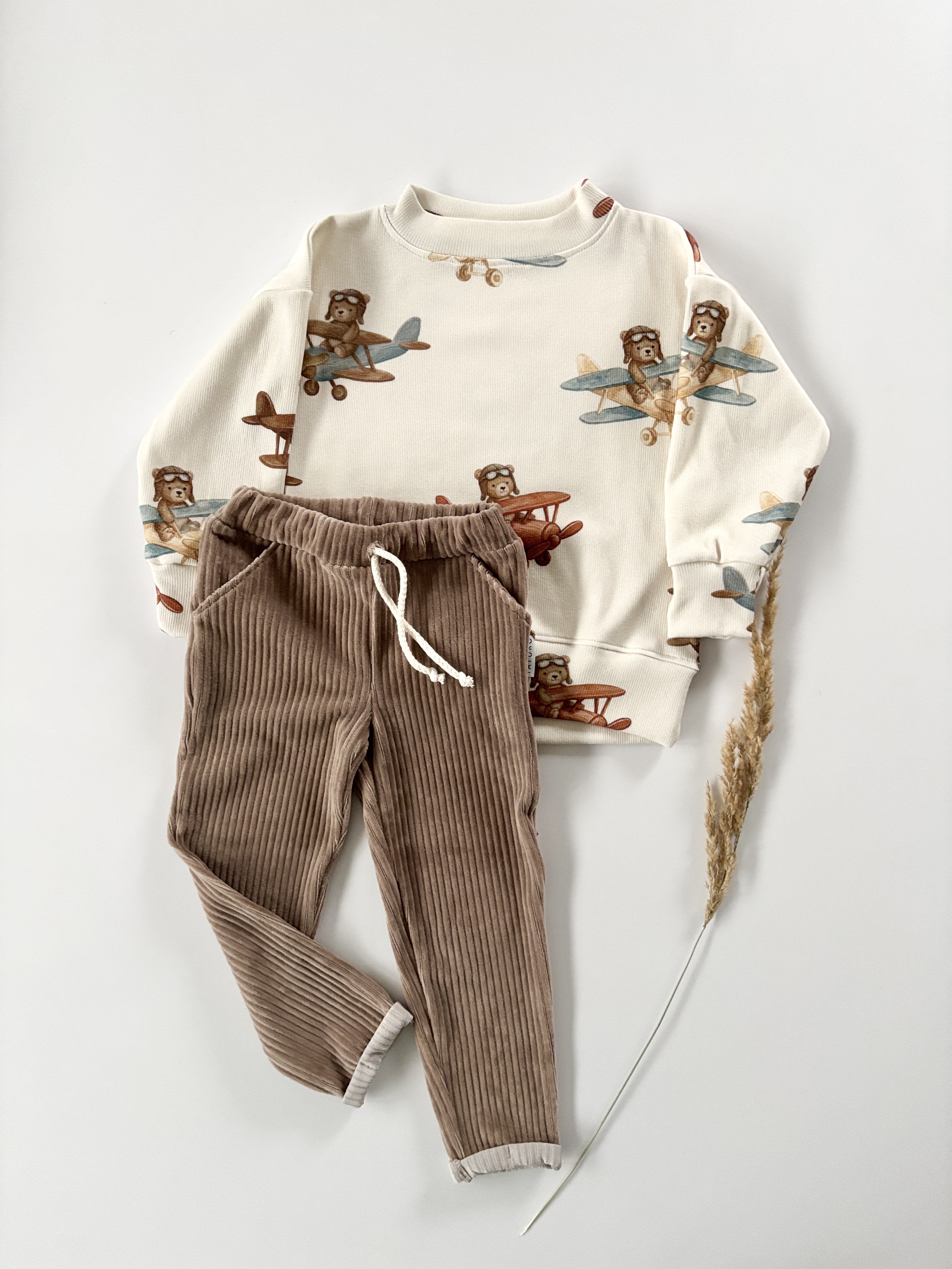 • kolor bluza prążkowana w samoloty  , spodnie sztruksowe w odcieniach brązu, beżu  (ustawienia monitora mogą powodować różnice w odcieniu),
