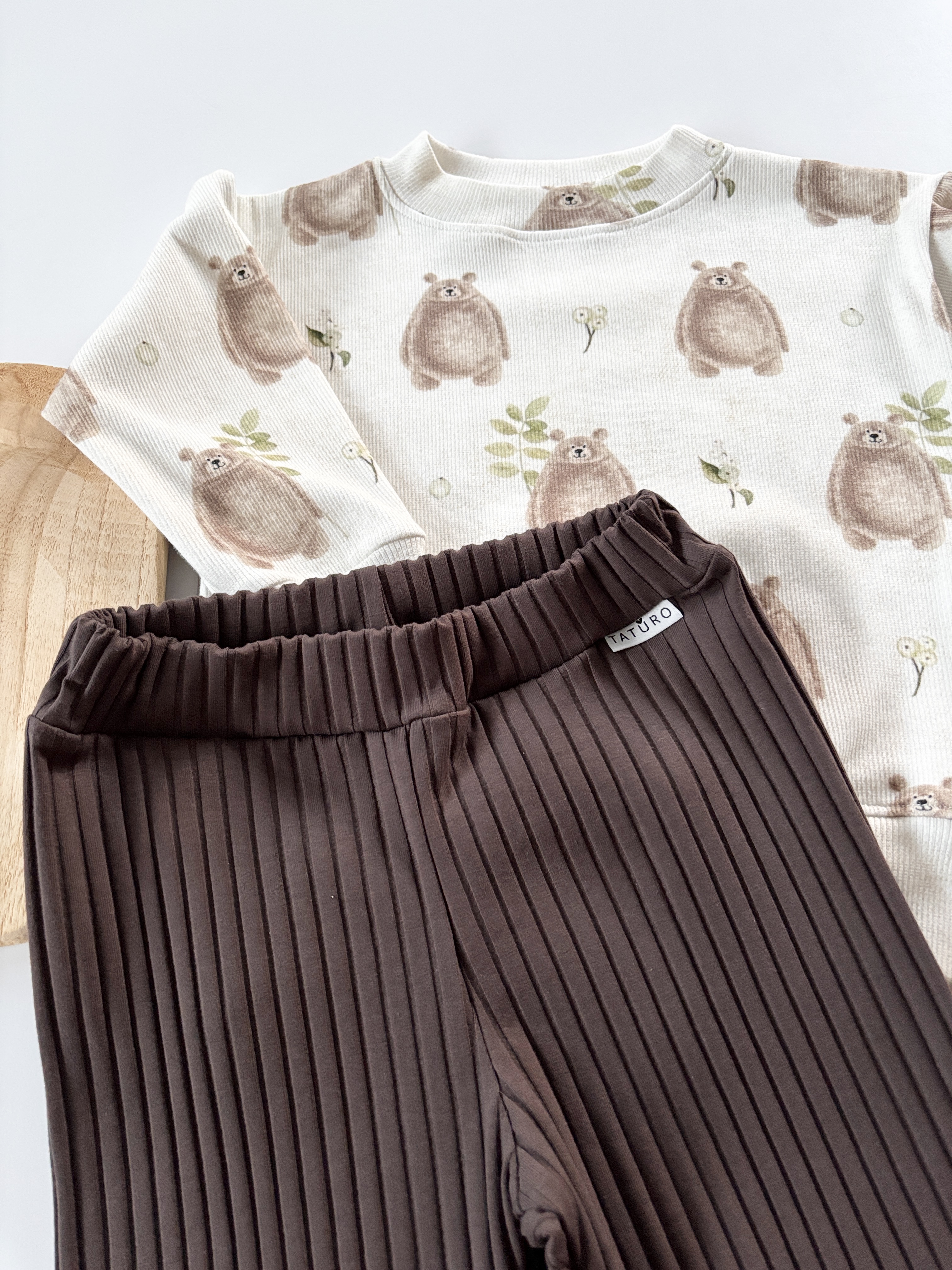 • kolor bluza prążkowana w misie  , legginsy w szeroki prążek ciemna czekolada    (ustawienia monitora mogą powodować różnice w odcieniu),
