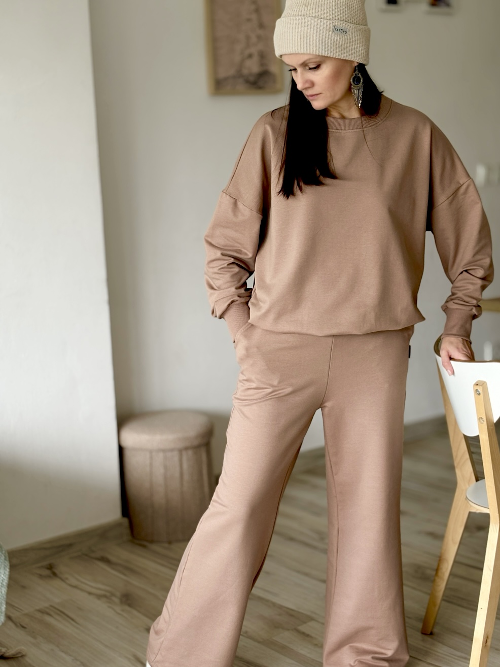 Komplet damski bluza + spodnie z szeroką nogawką cynamon