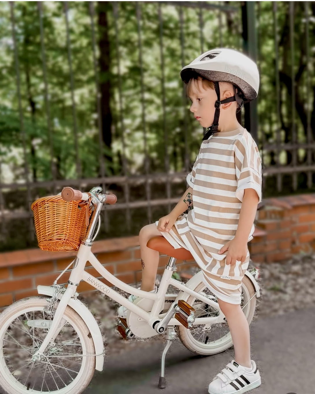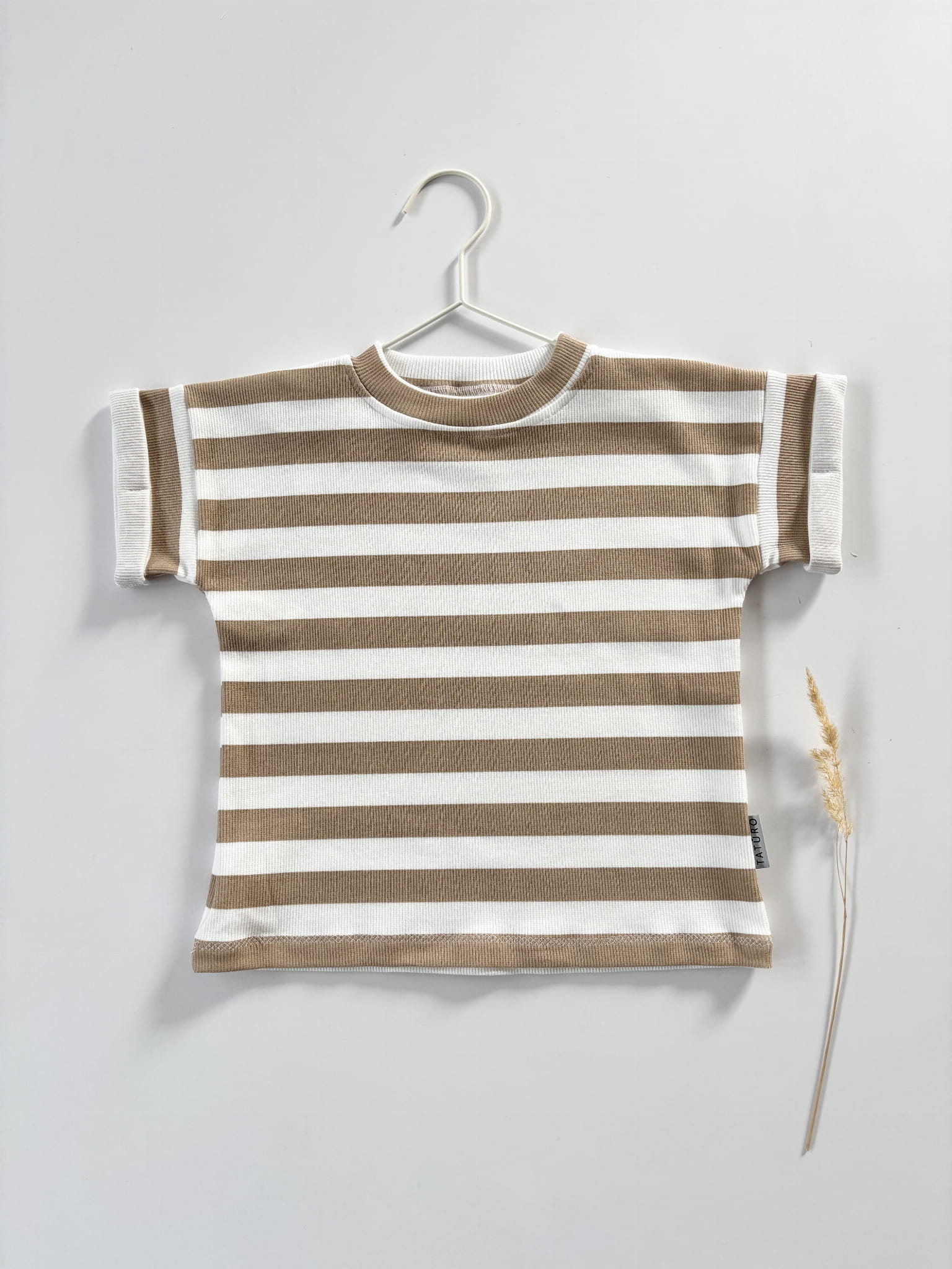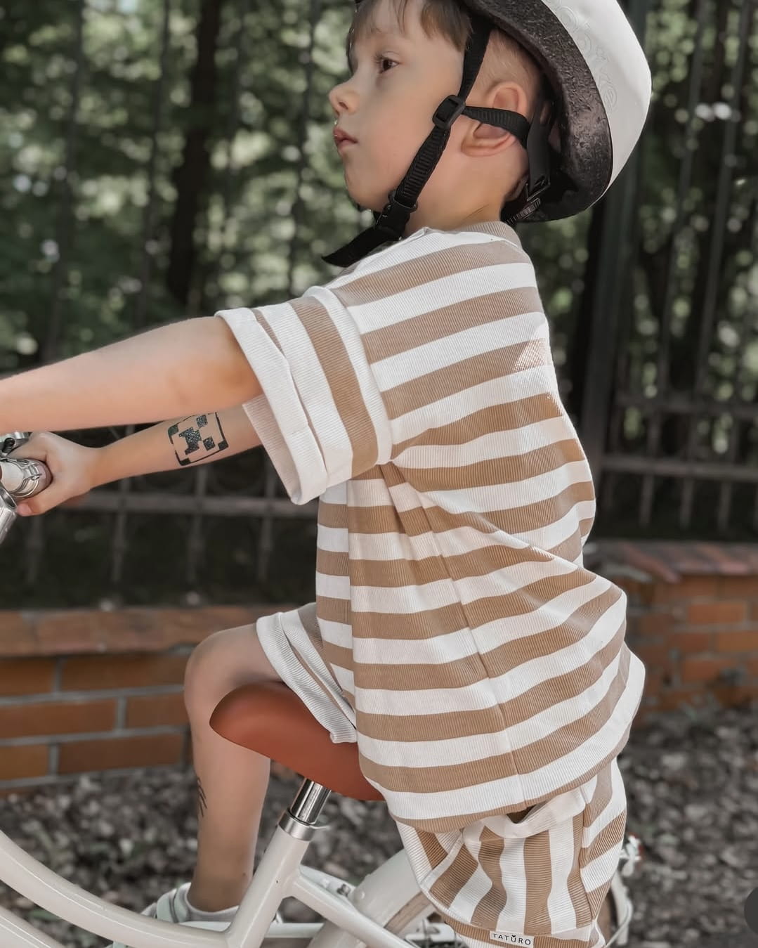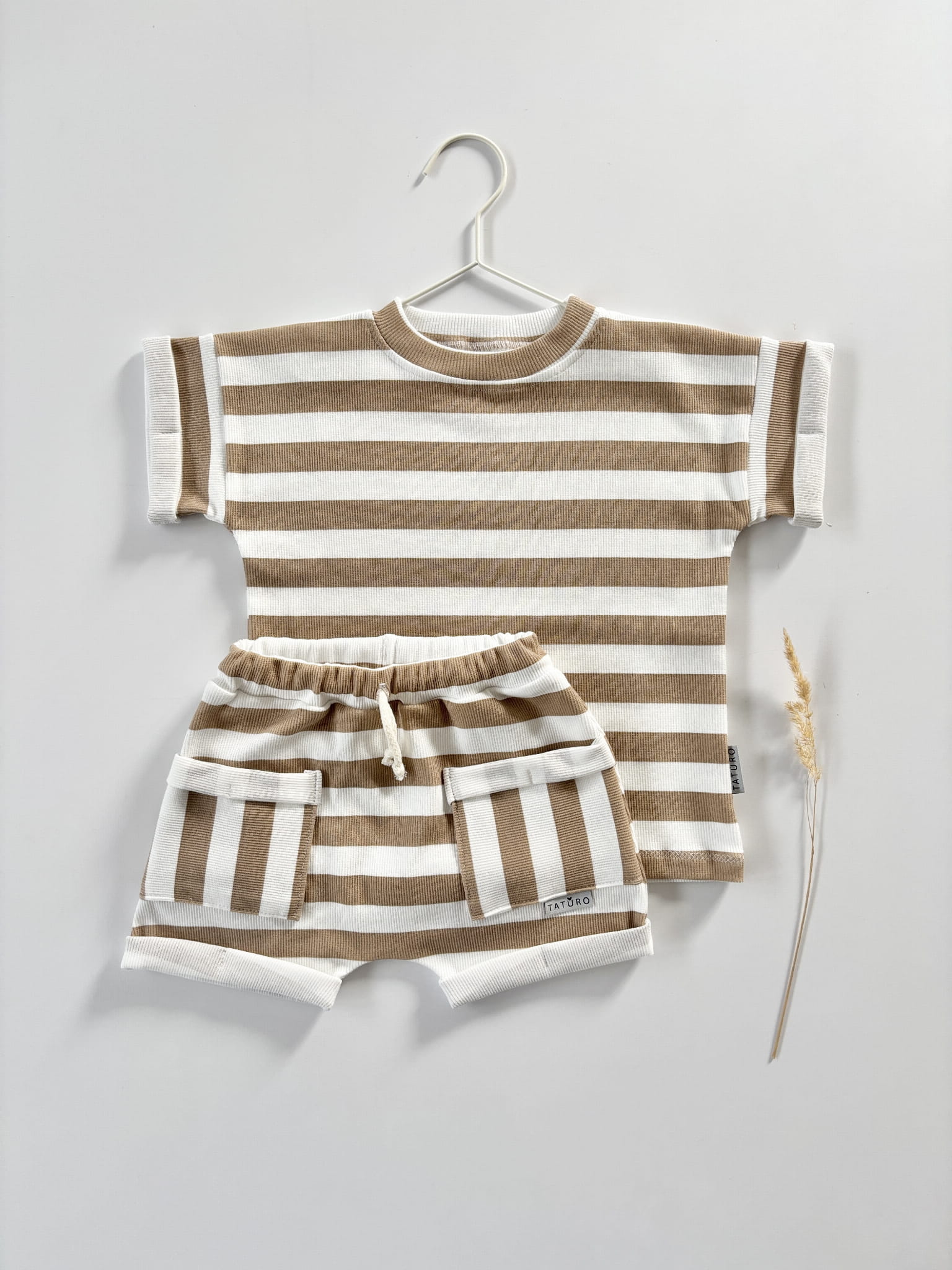 Komplet t-shirt prążkowany strips latte + szorty z kieszonkami strips latte