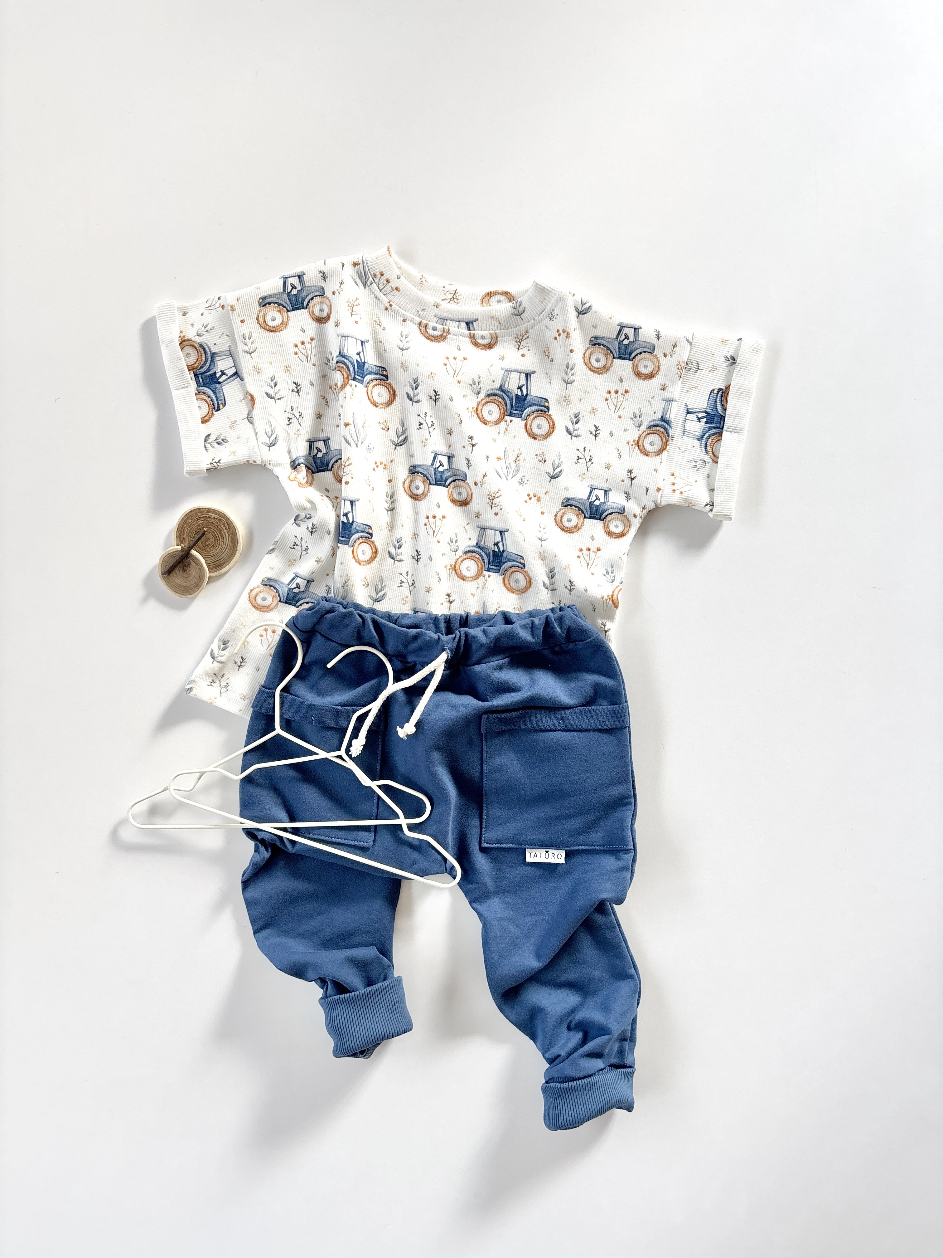 • kolor t-shirt prążkowana w traktory, spodnie granat (ustawienia monitora mogą powodować różnice w odcieniu),