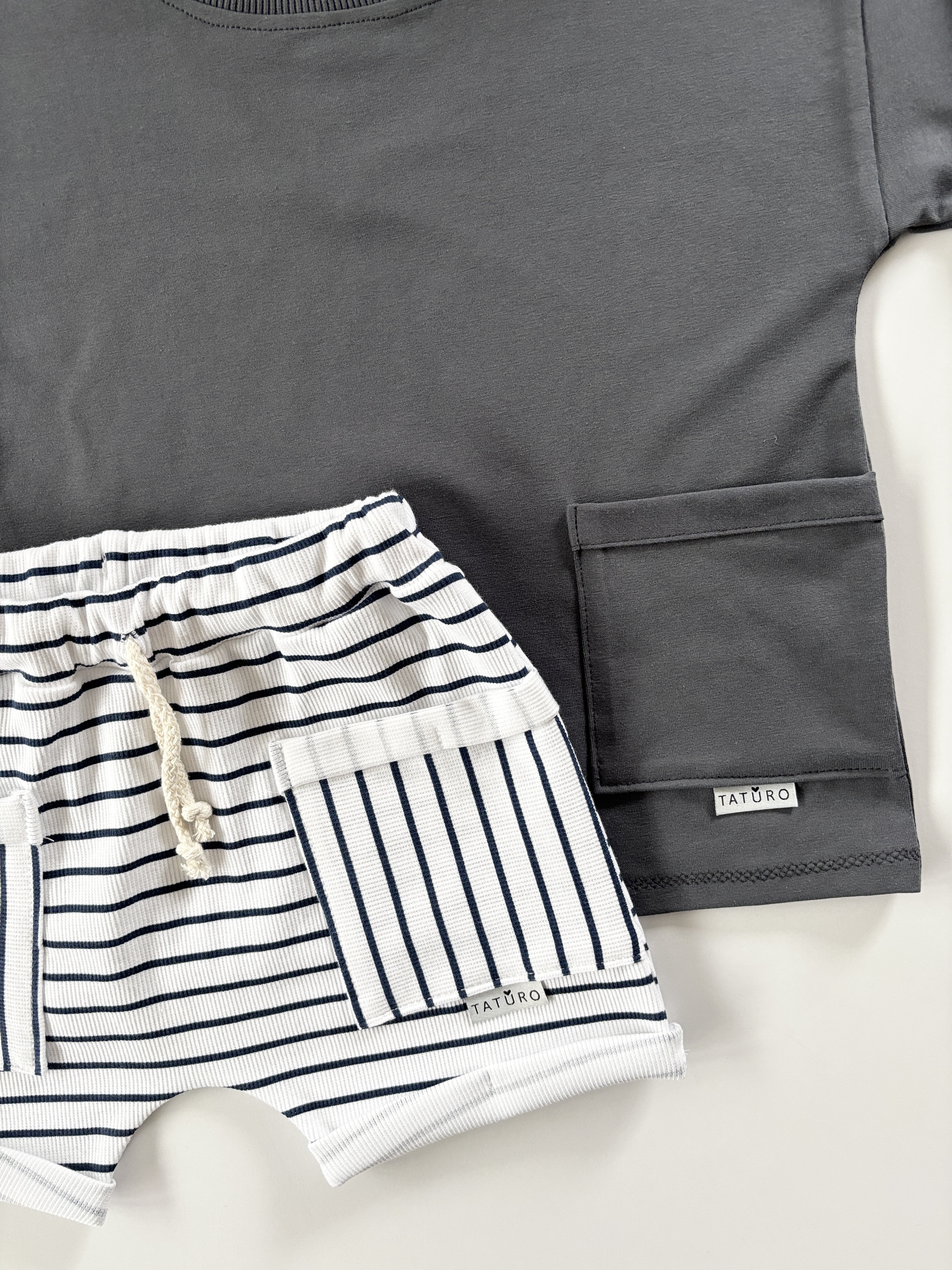 Komplet t-shirt z kieszonka grafit + szorty strips navy z kieszonkami