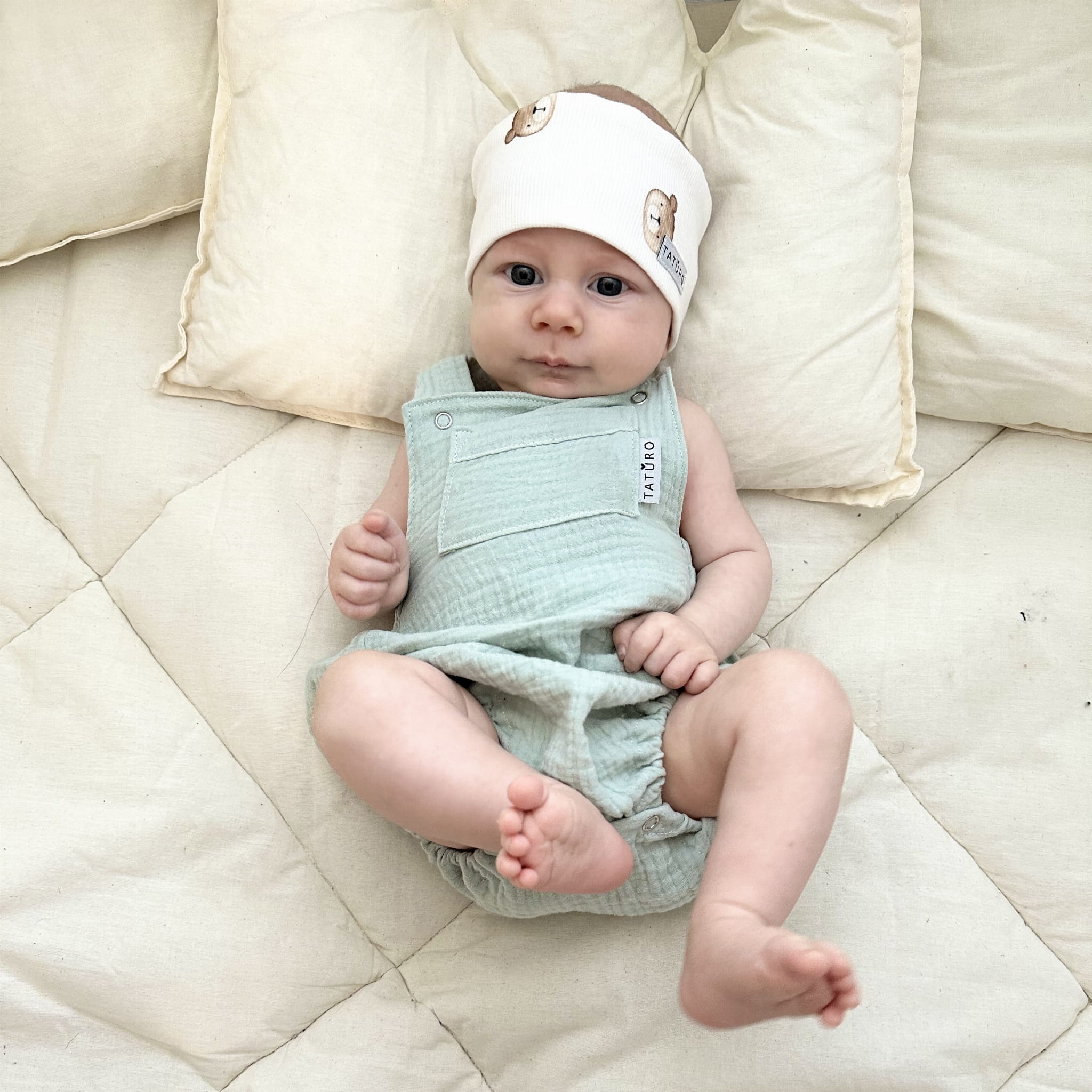 - rampers wykonany z wysokiej jakości dzianiny bawełnianej muślinowe,