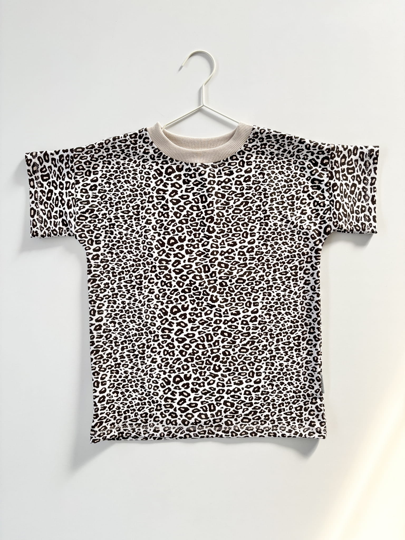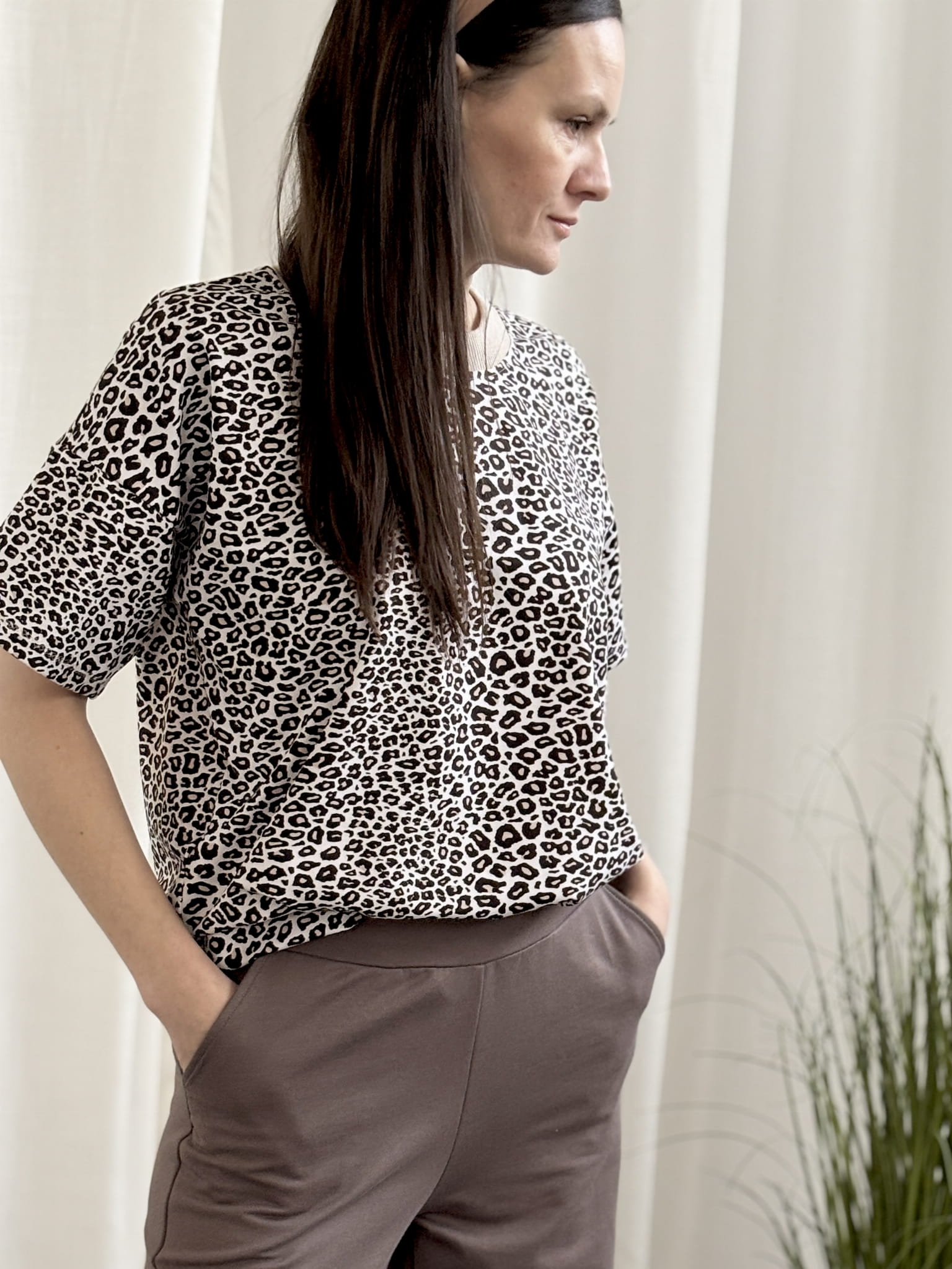 - Krój: Luźny, oversize z krótkimi rękawami zakończonymi mankietami,